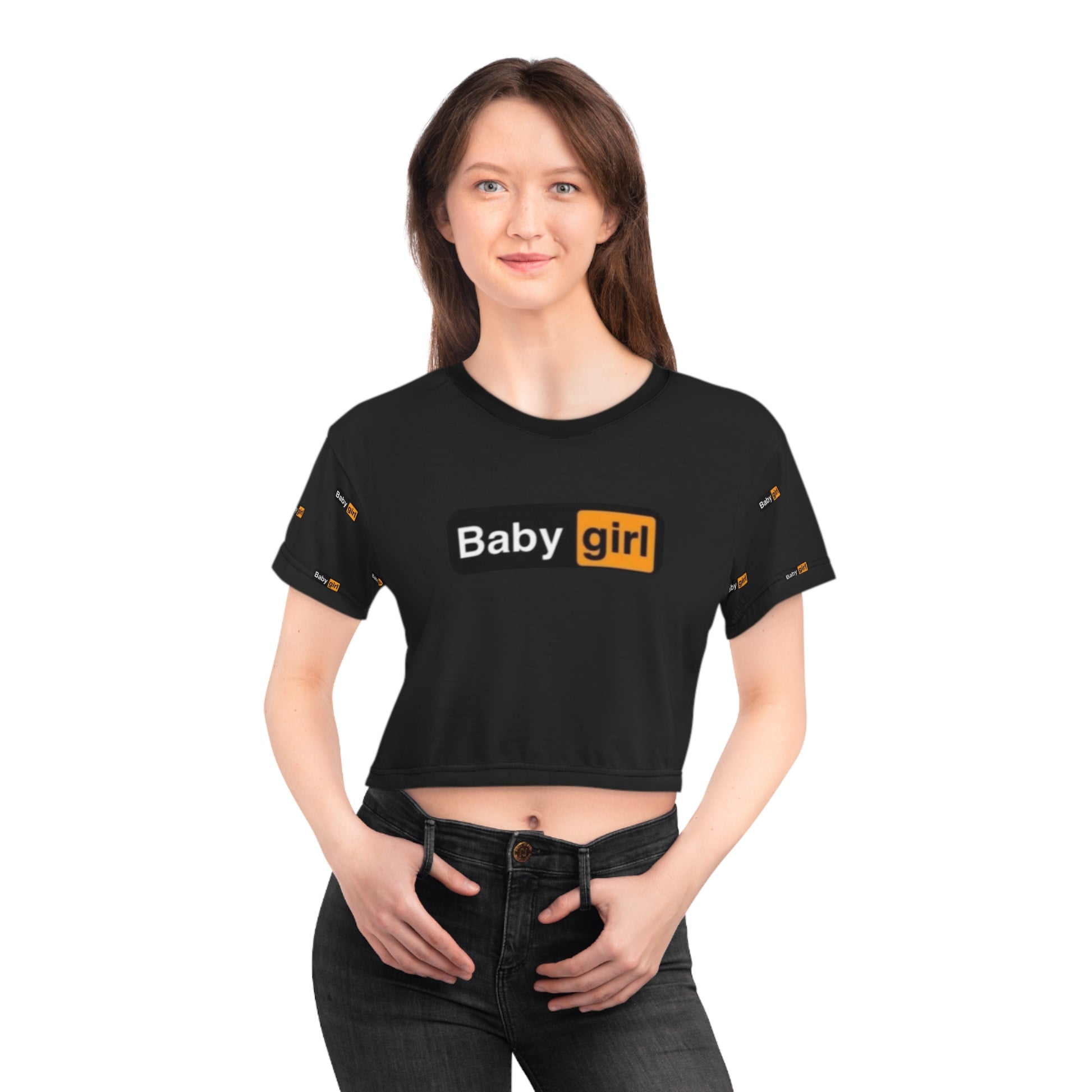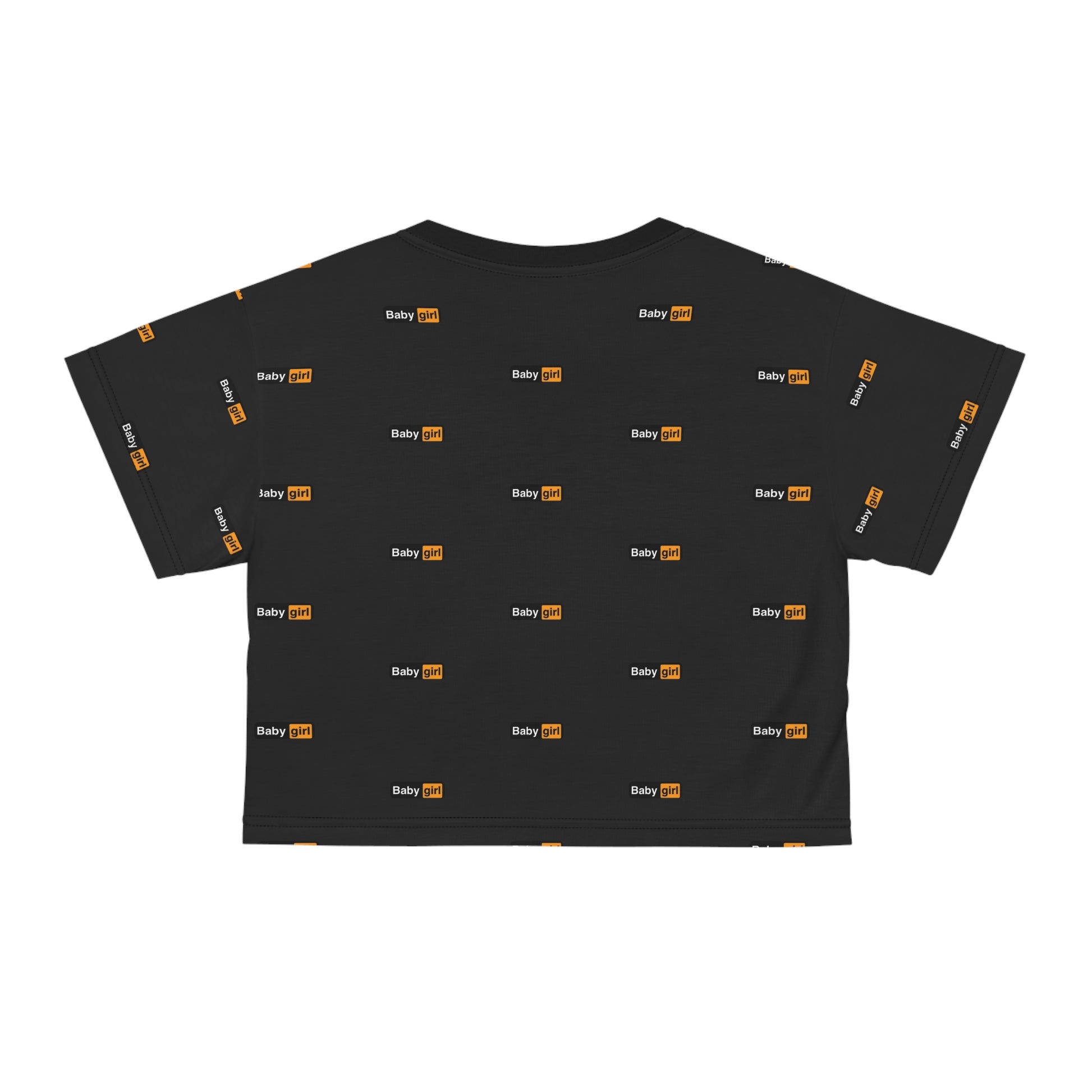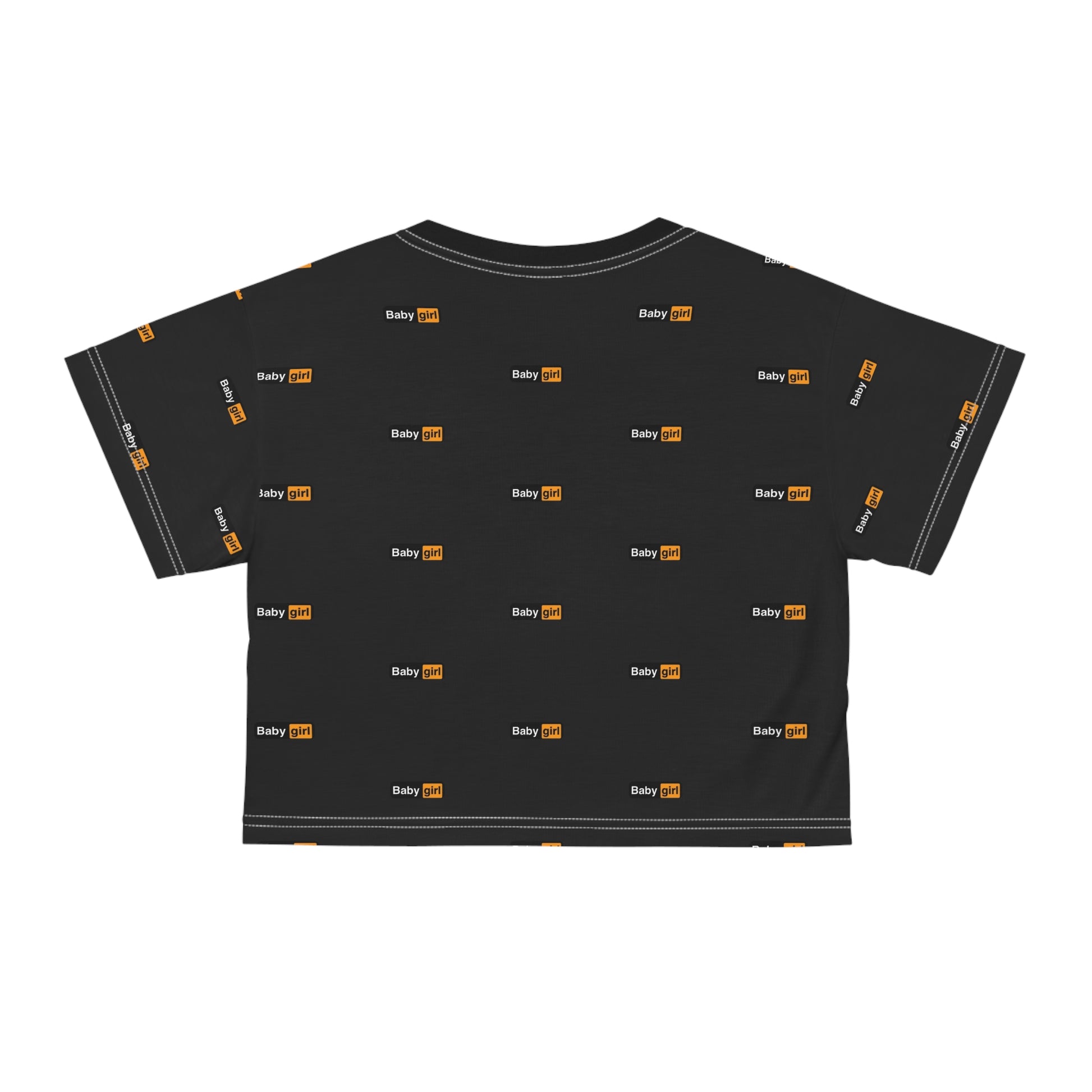 This cropped tee brings confident, playful energy to everyday streetwear. Lightweight and breathable, it drapes just above the waist for a relaxed, modern silhouette. The bold, repeating "Baby girl" motif against a deep black ground reads like a cheeky badge of attitude —small icons pepper the sleeves and back to keep the look cohesive from every angle. Wear it with high-waisted jeans, layered under an oversized blazer, or paired with your favorite skate shorts for late-summer hangs and city nights. It’s made to move, fade-resistant, and uncomplicated: slip it on and let the graphic do the talking.