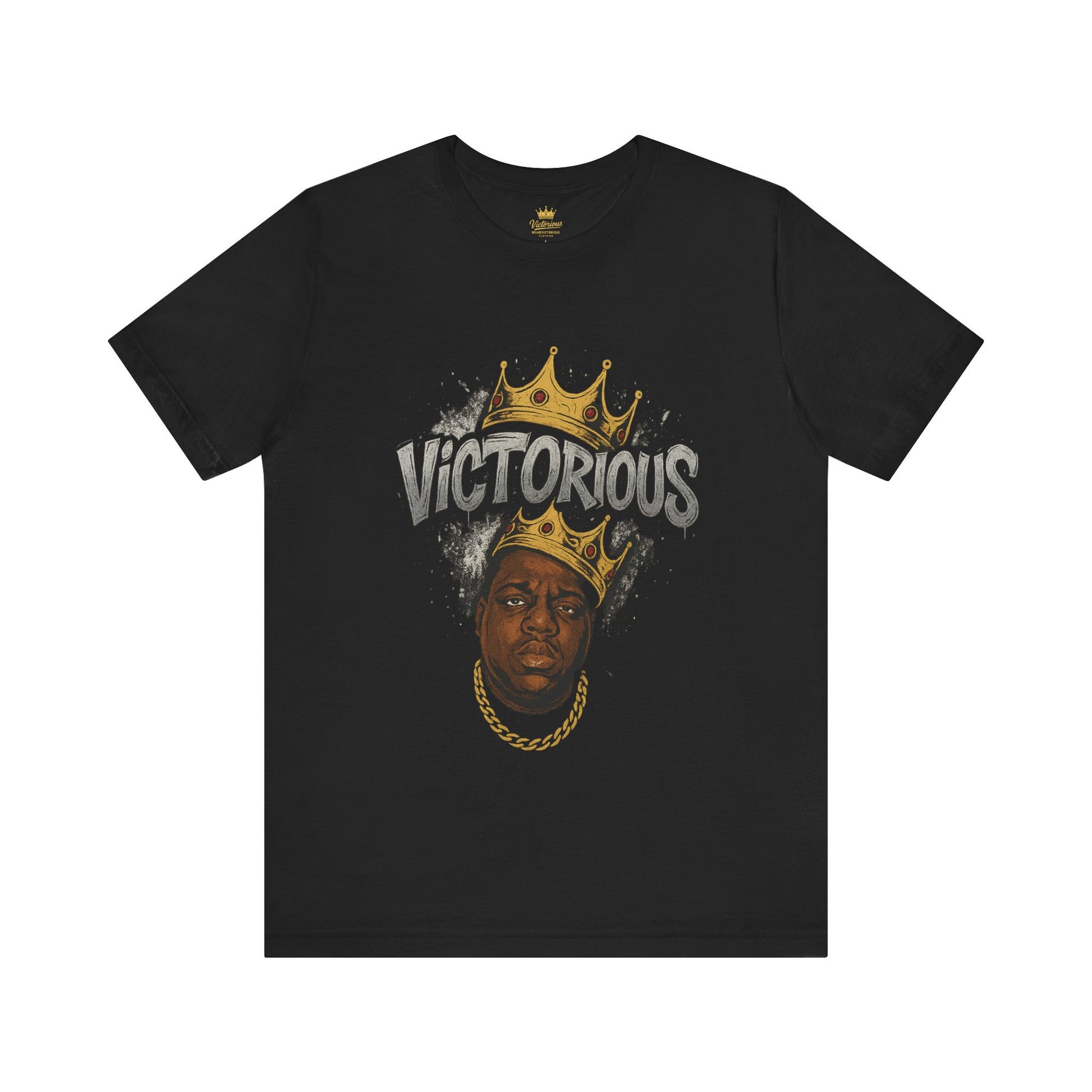 A lightweight, breathable tee that carries attitude and confidence. Soft Airlume combed cotton feels gentle against skin while the ribbed crew neck and side seams keep the silhouette neat after many wears. The front art features a bold illustrated portrait wearing a gold crown with the word “VICTORIOUS” arched above — a graphic that reads like a personal mantra, not just decoration. Wear it solo with jeans or layer under a jacket for nights out. It settles into everyday rotation for anyone who wants a shirt that looks lived-in and meaningful from the first wear.