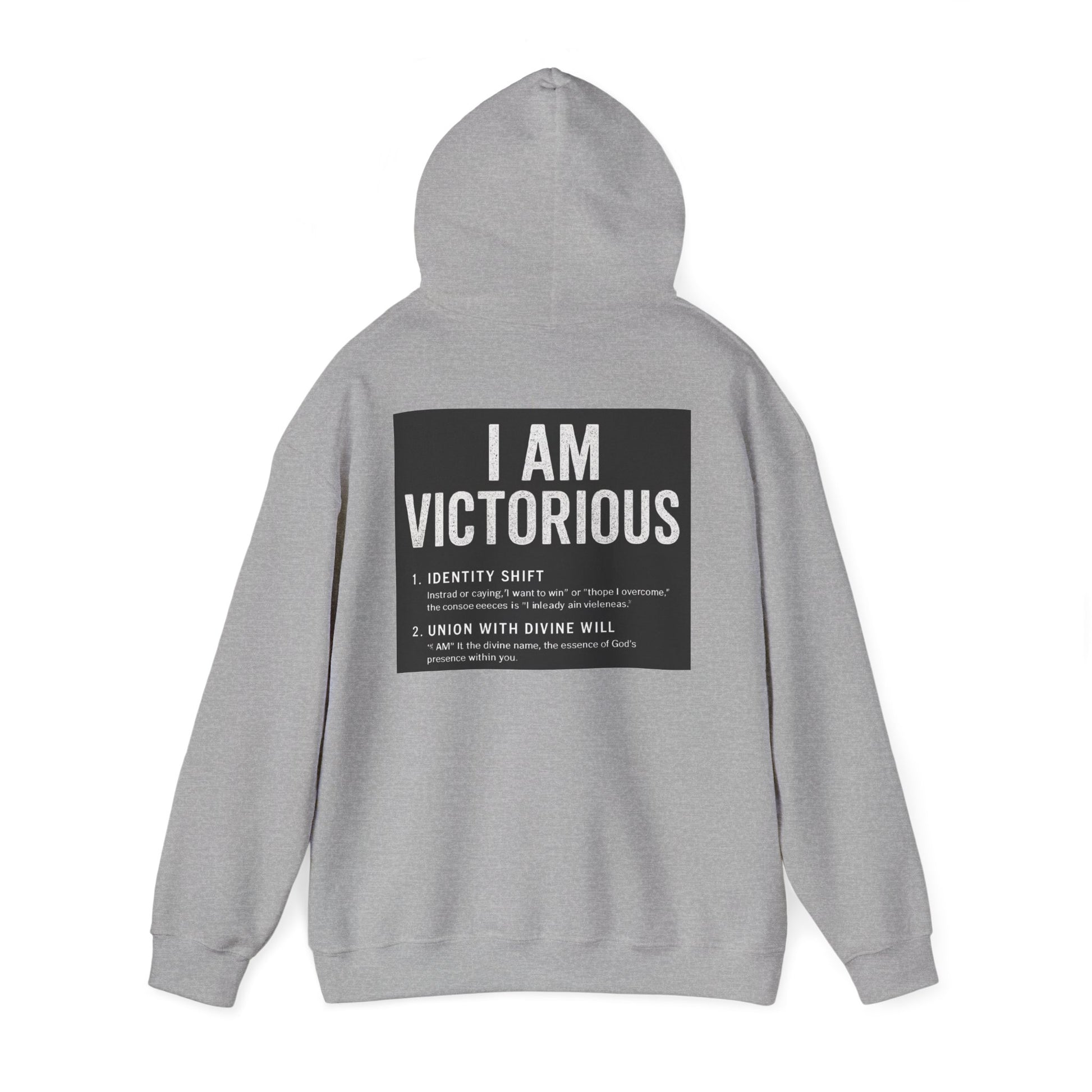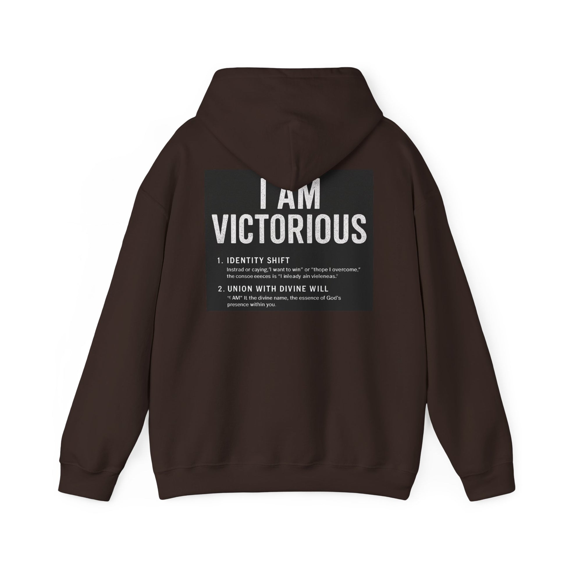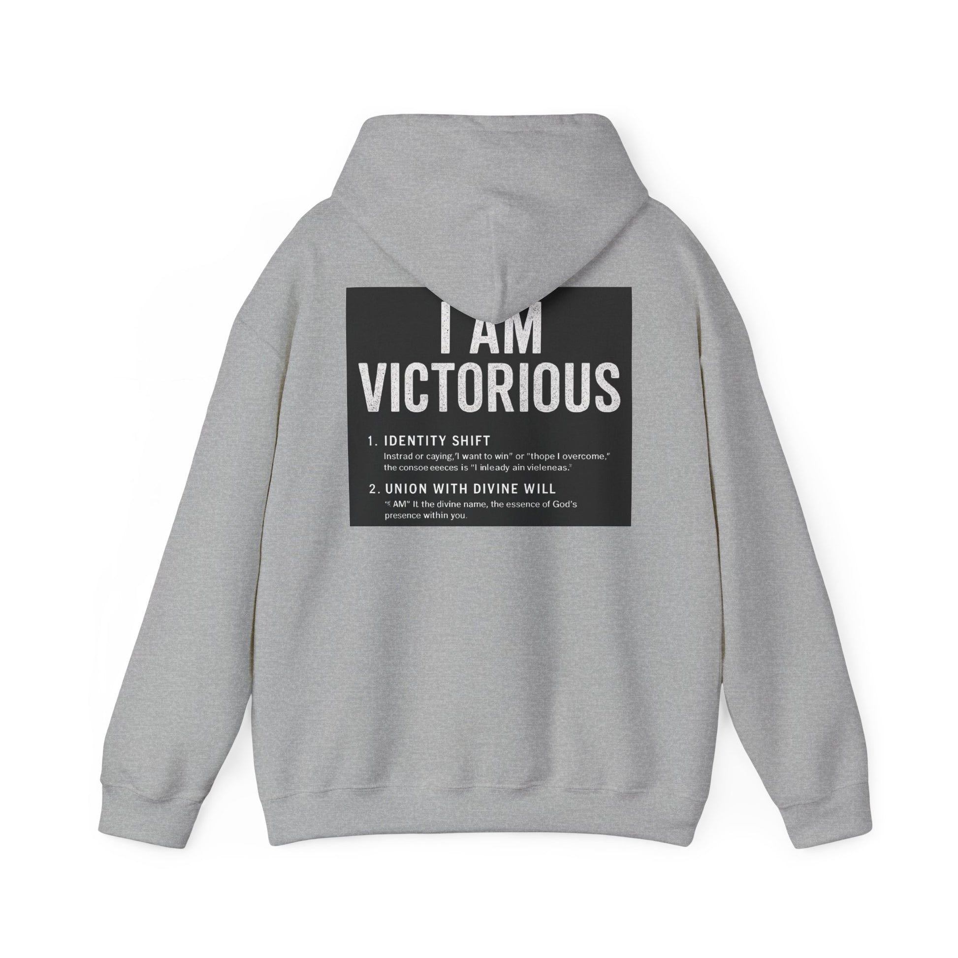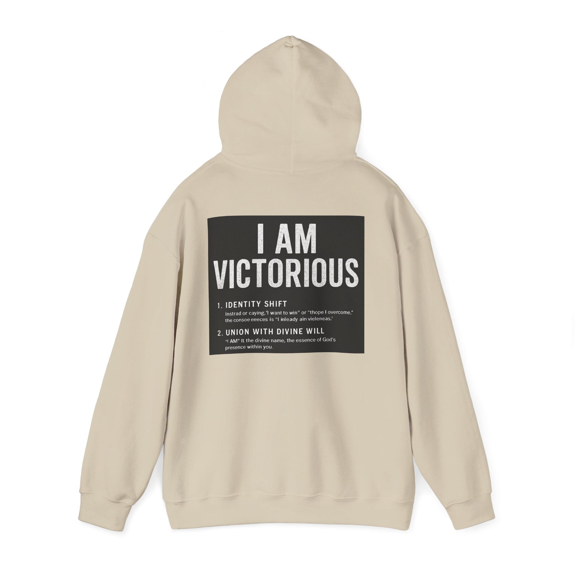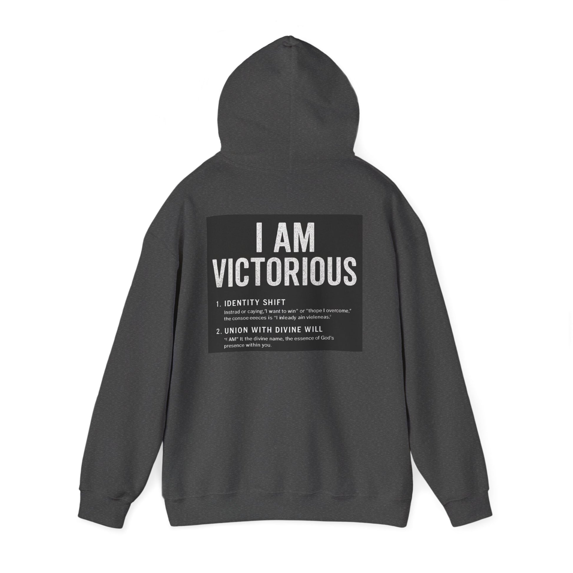 This cozy hooded sweatshirt carries a quietly confident message: subtle crowned lettering at the front and a bold, statement panel across the back. It feels like a personal anthem you can wear — soft and warm against chilly mornings, with a roomy pouch for cold hands and a double-lined hood to pull up when you need a quiet pause. The minimalist crown and 'VICTORIOUS' script on the chest reads like a reminder; the back’s framed declaration turns heads without shouting. Lightweight enough to layer, substantial enough to be the go-to when you want comfort and calm assurance in one piece.
