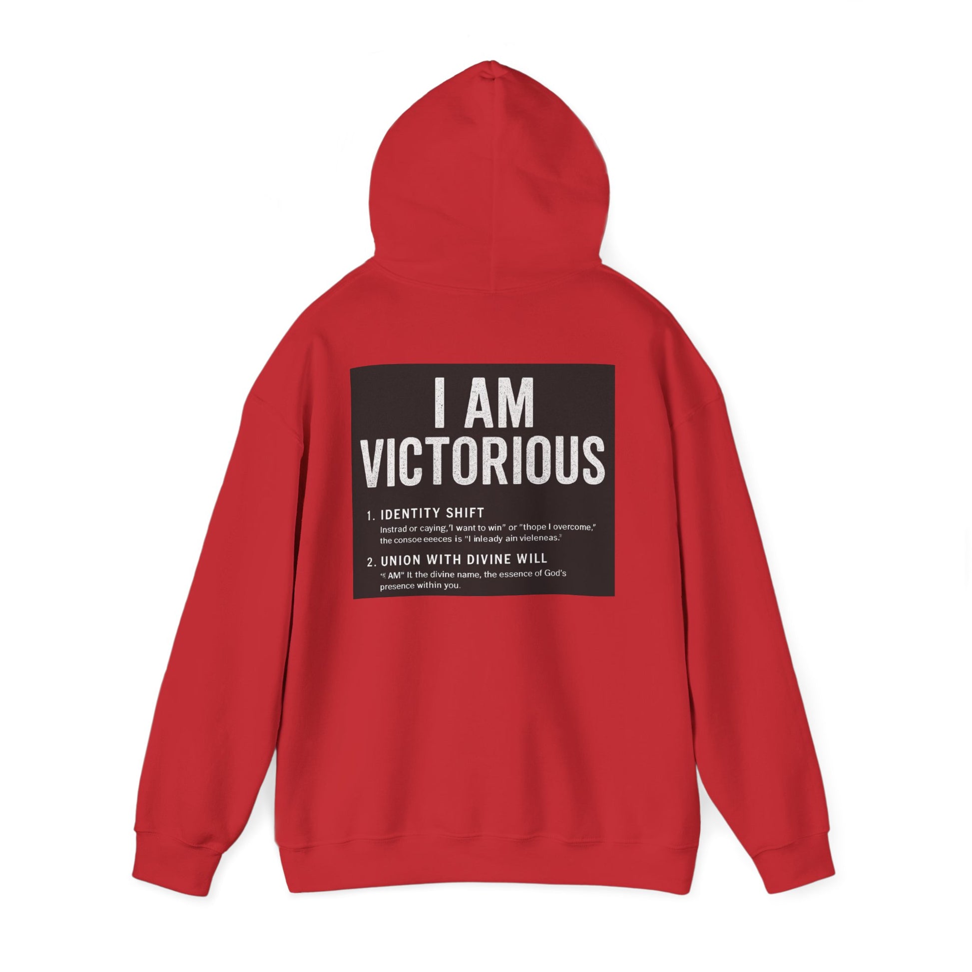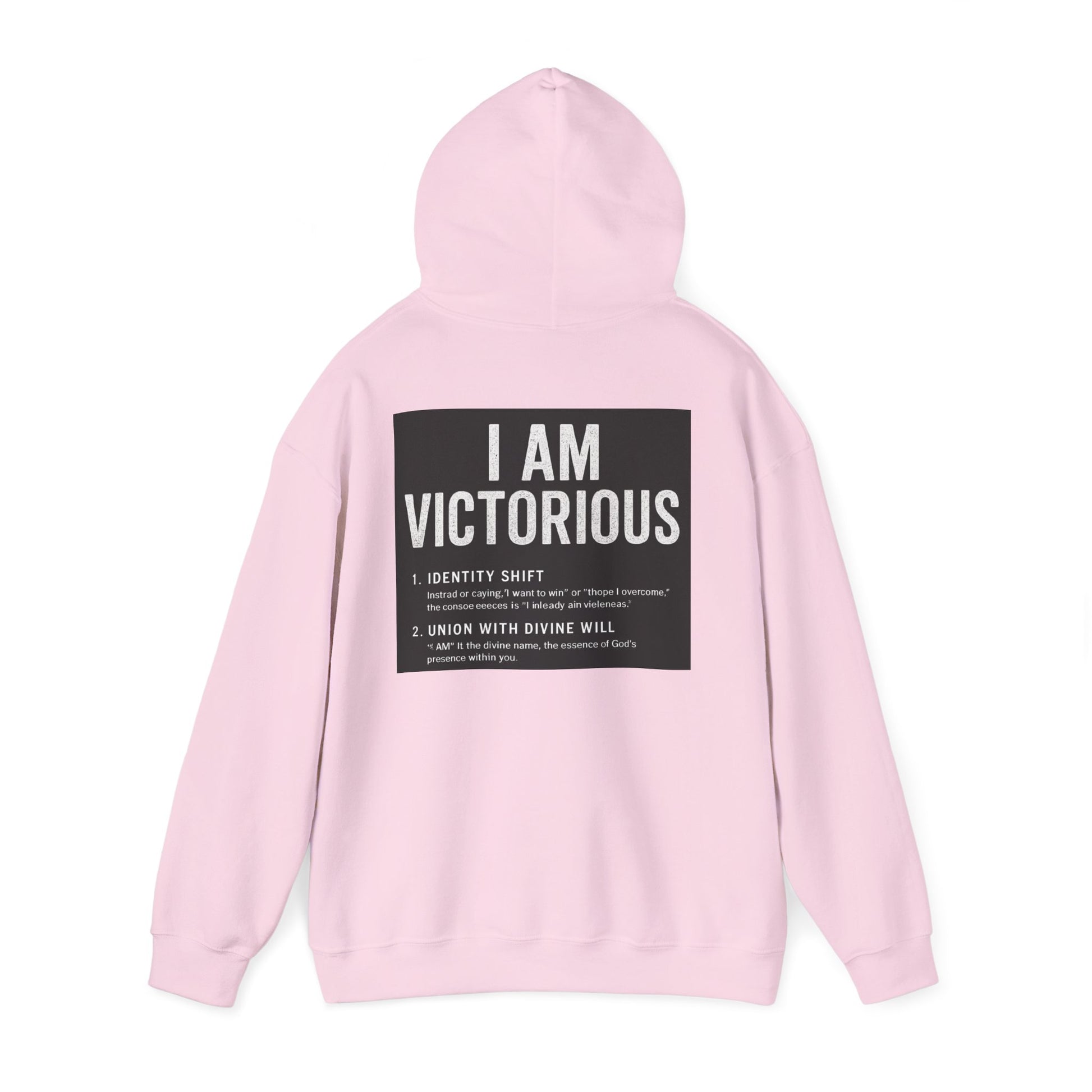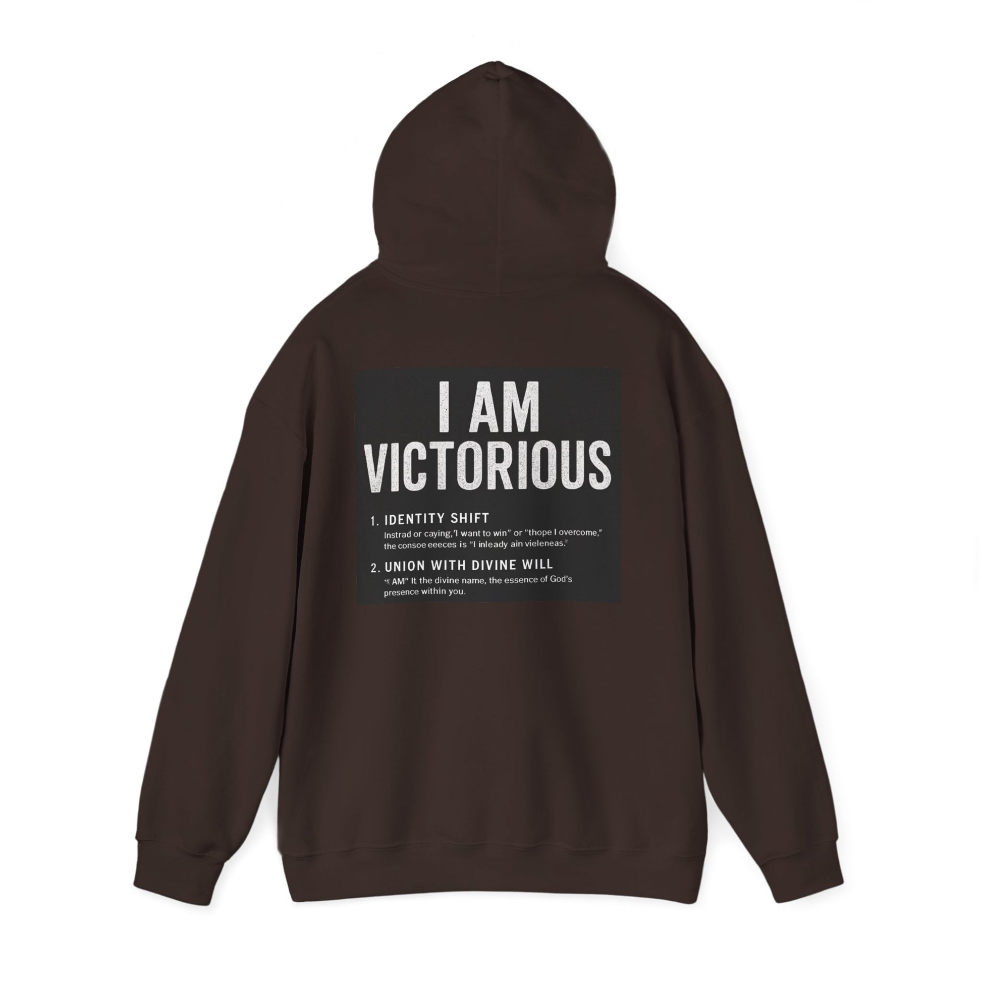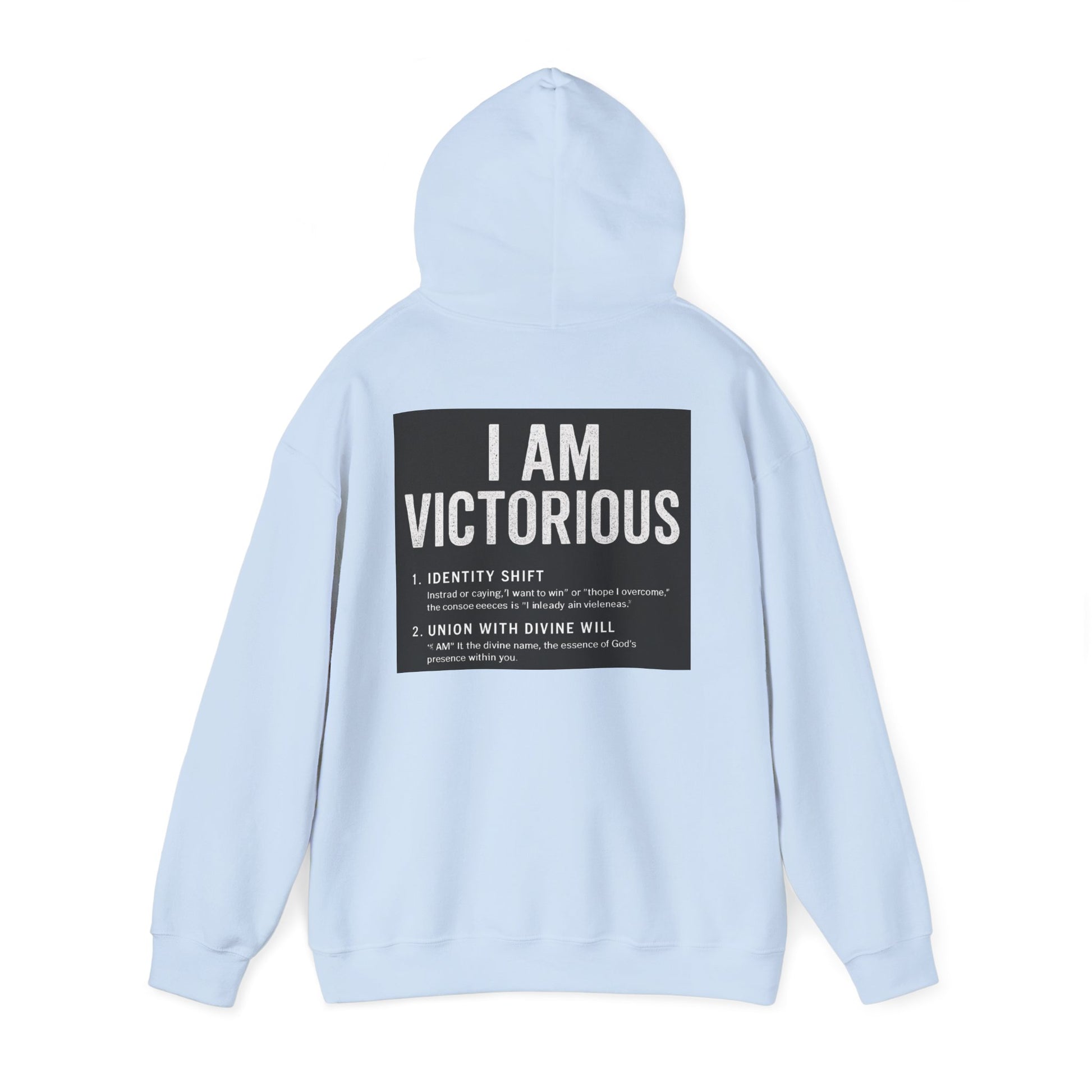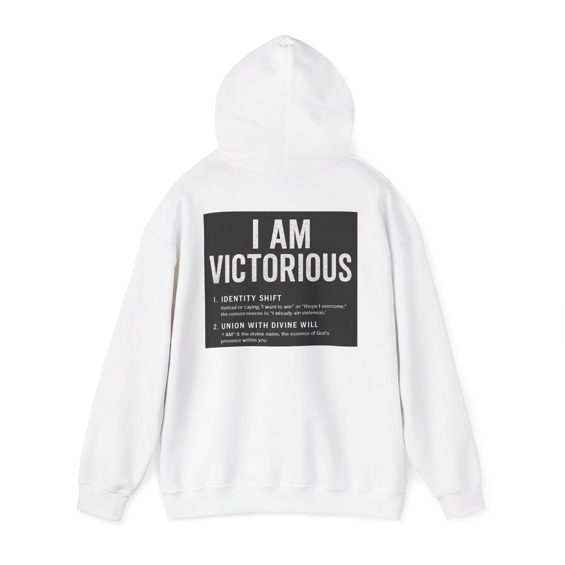 This cozy hooded sweatshirt carries a quietly confident message: subtle crowned lettering at the front and a bold, statement panel across the back. It feels like a personal anthem you can wear — soft and warm against chilly mornings, with a roomy pouch for cold hands and a double-lined hood to pull up when you need a quiet pause. The minimalist crown and 'VICTORIOUS' script on the chest reads like a reminder; the back’s framed declaration turns heads without shouting. Lightweight enough to layer, substantial enough to be the go-to when you want comfort and calm assurance in one piece.